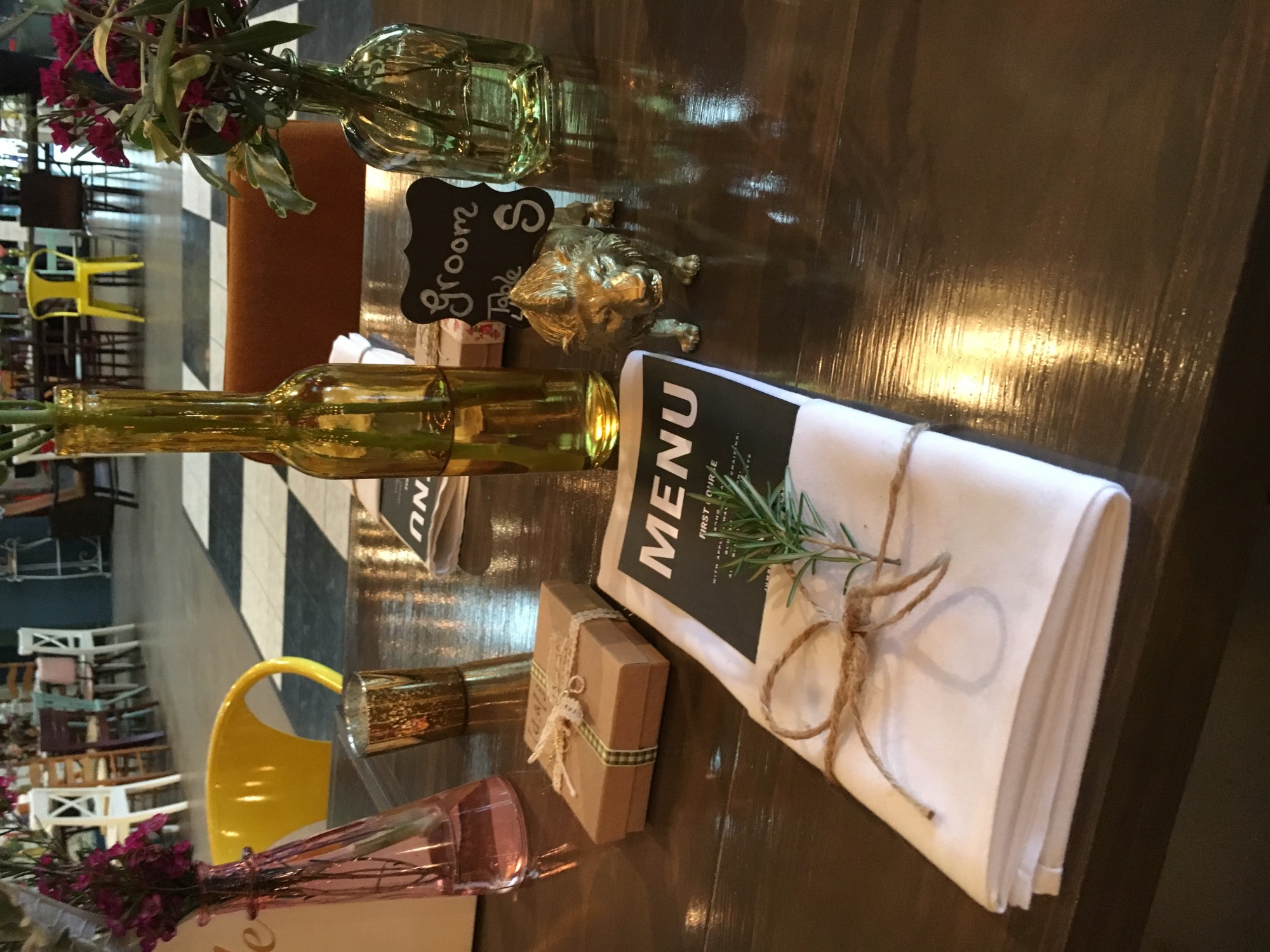 Danielle had farm tables with flowers from Ivory and Beau in small different colored medicine bottles. Custom designed menu cards that they tucked neatly in a napkins with a dainty piece of twine and a sprig of rosemary. Danielle also had an impressive collection of brass candle holders, when we lit the candles it was magical the venue was glowing.